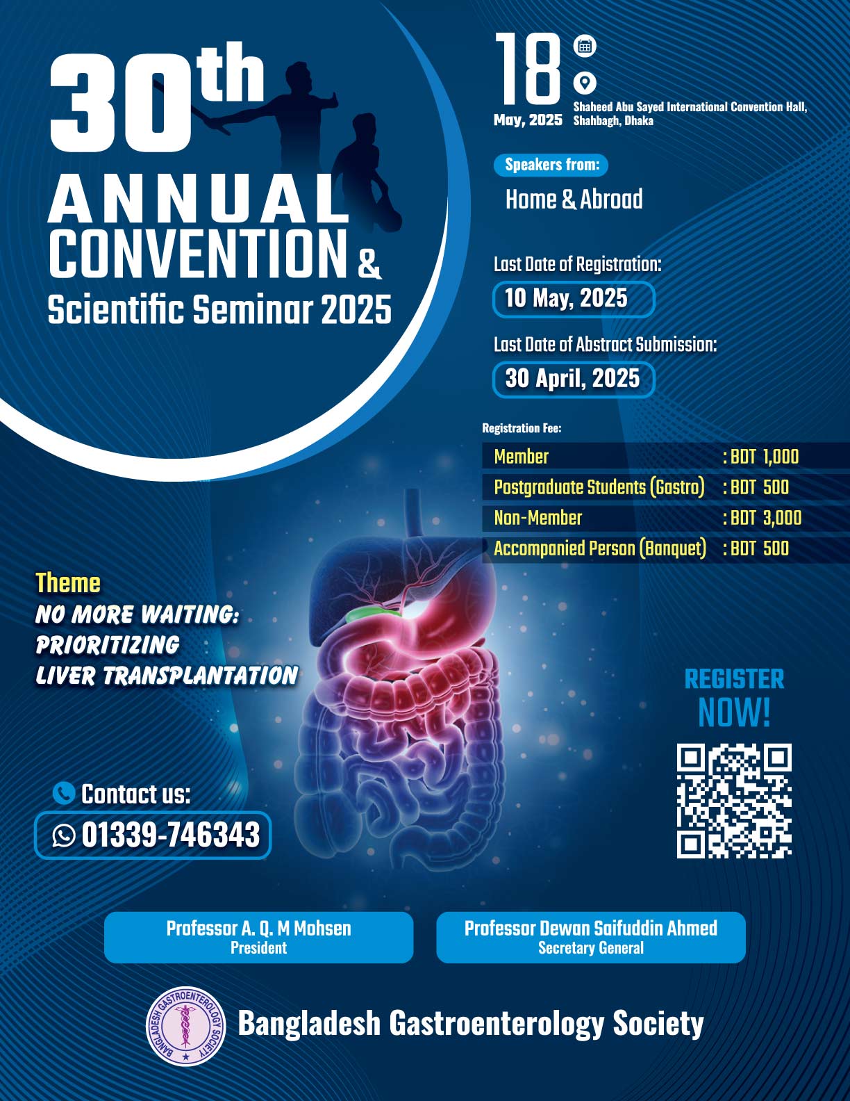 On behalf of the Bangladesh Gastroenterology Society (BGS), we are honored to invite you to the 30th Annual Convention & Scientific Seminar, taking place on May 18, 2025, at the Shaheed Abu Sayed Convention Centre, Dhaka, Bangladesh.